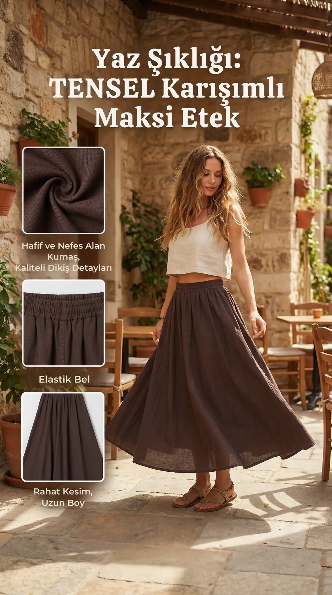 Kadın Cepli Lastikli Bel Modal Midi Etek