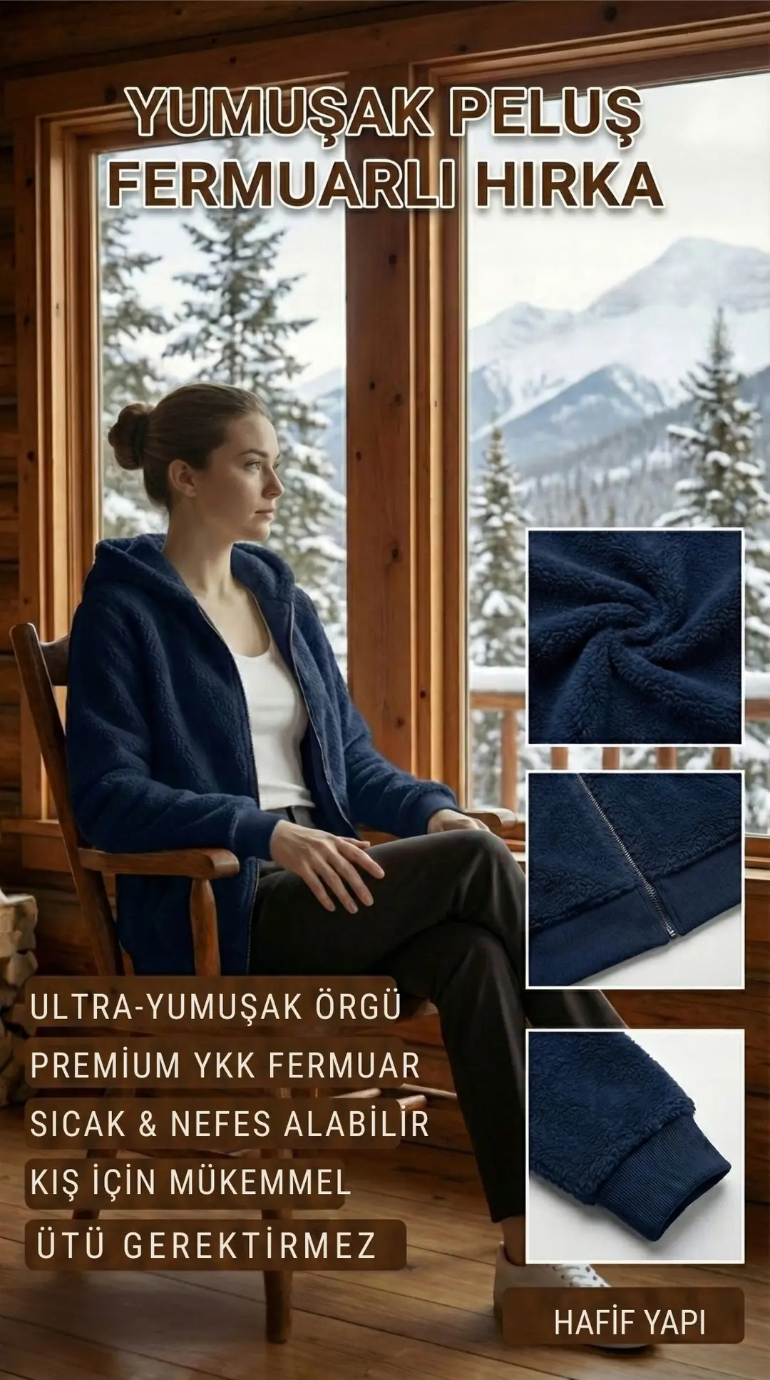 • Kadın Fermuarlı Kapüşonlu Uzun Peluş Polar Hırka