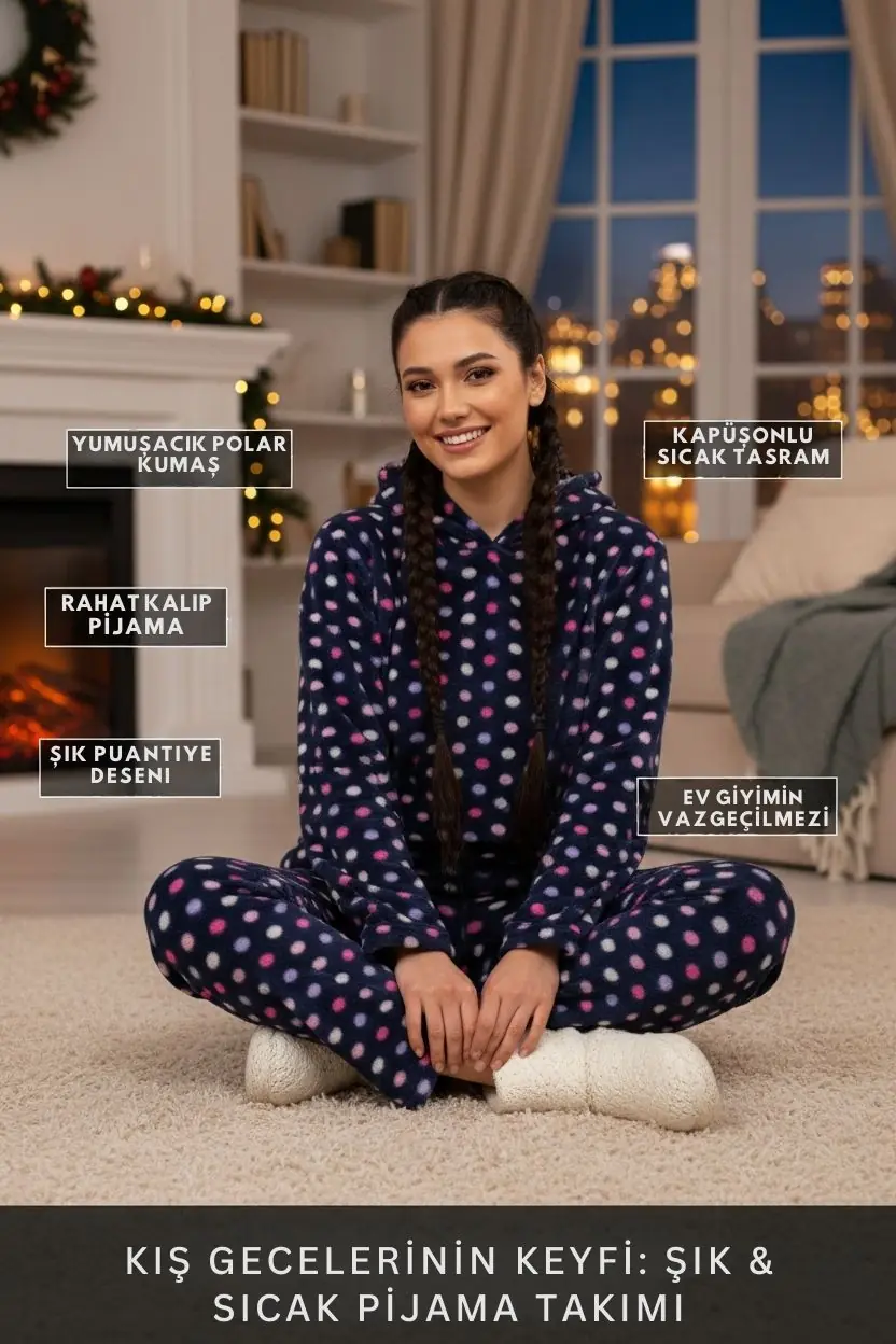 Kadın Kışlık Polar Alt-Üst Lastikli Bel Kapüşonlu Pijama Takımı