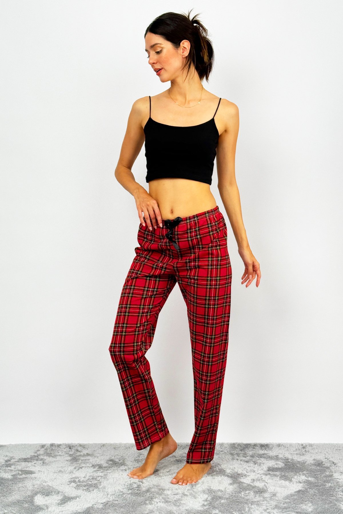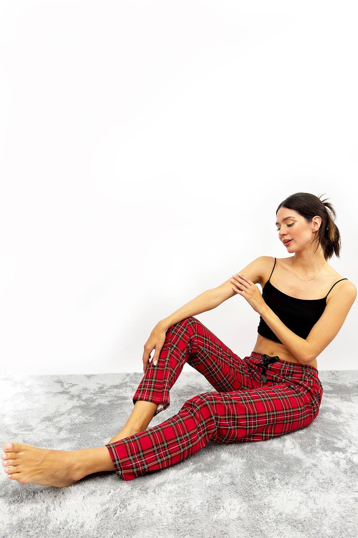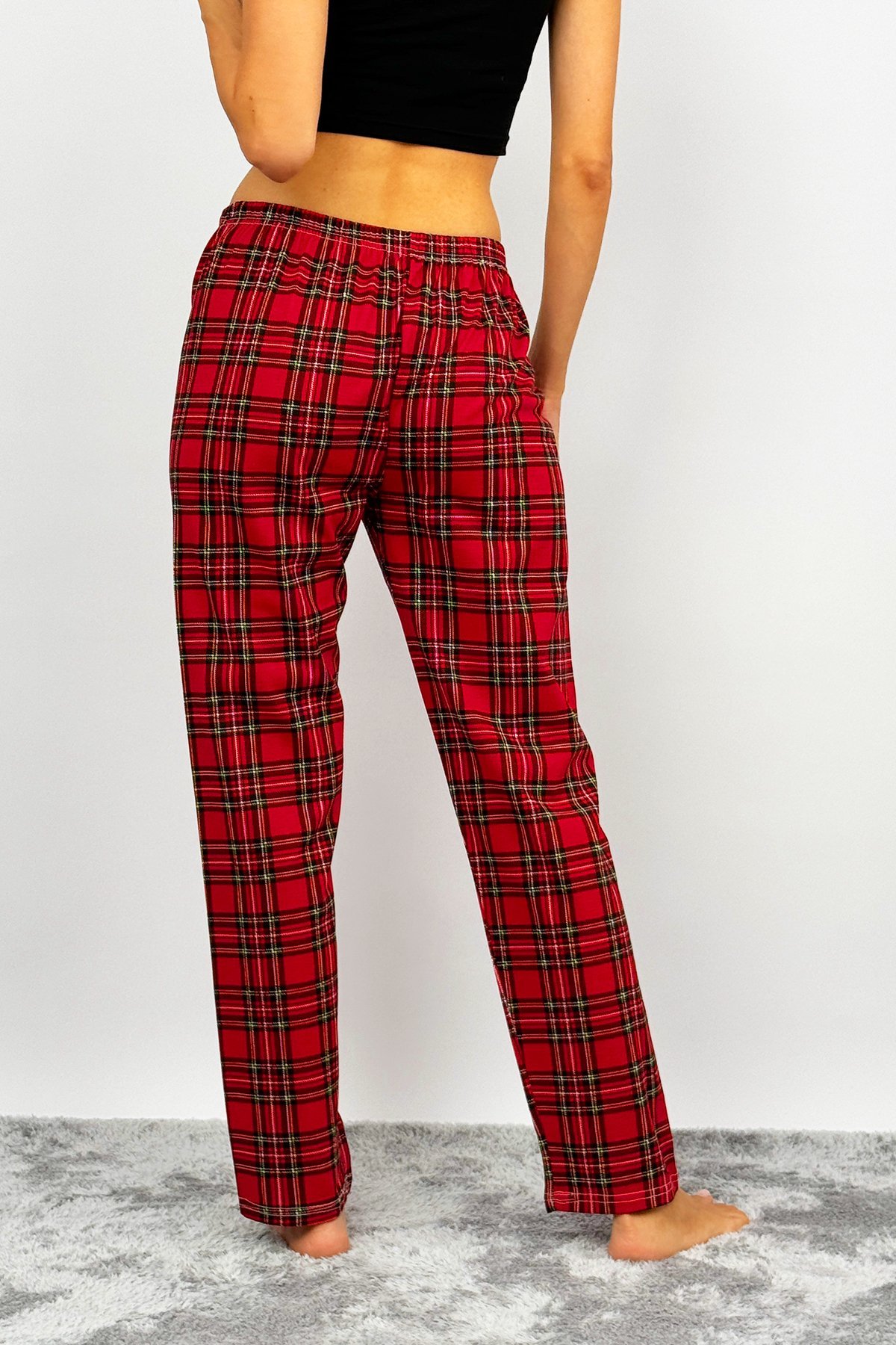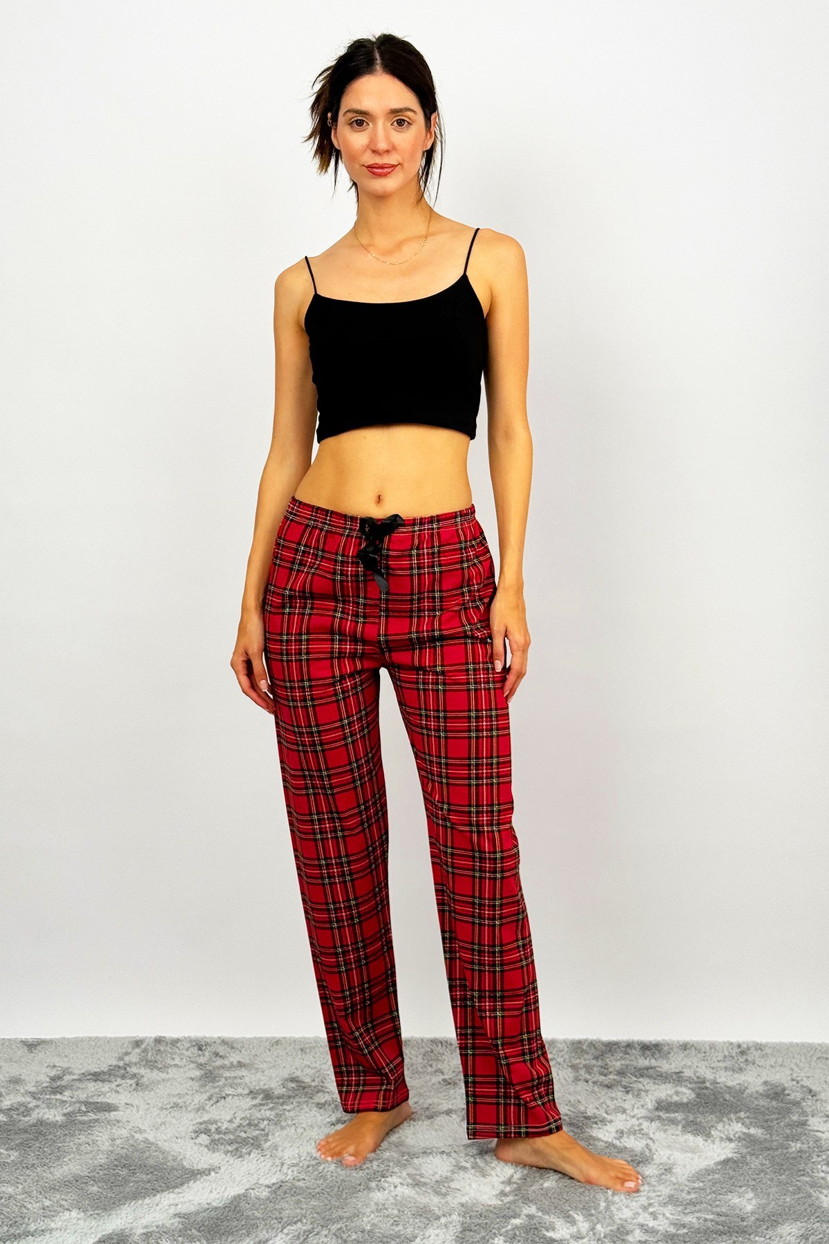 • Kadın Pamuklu Ekose Desenli Pijama Altı Eşofman Kurdeleli