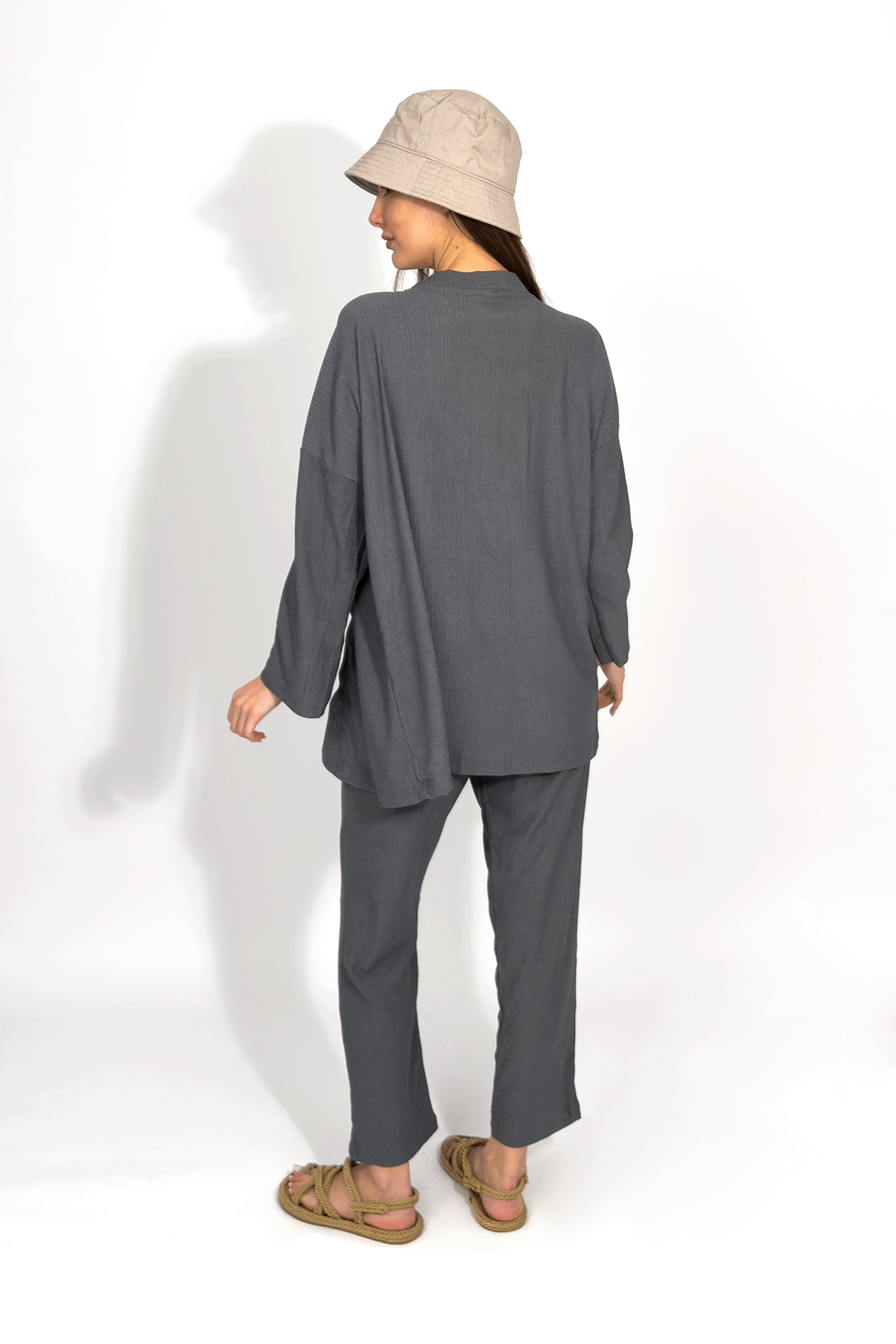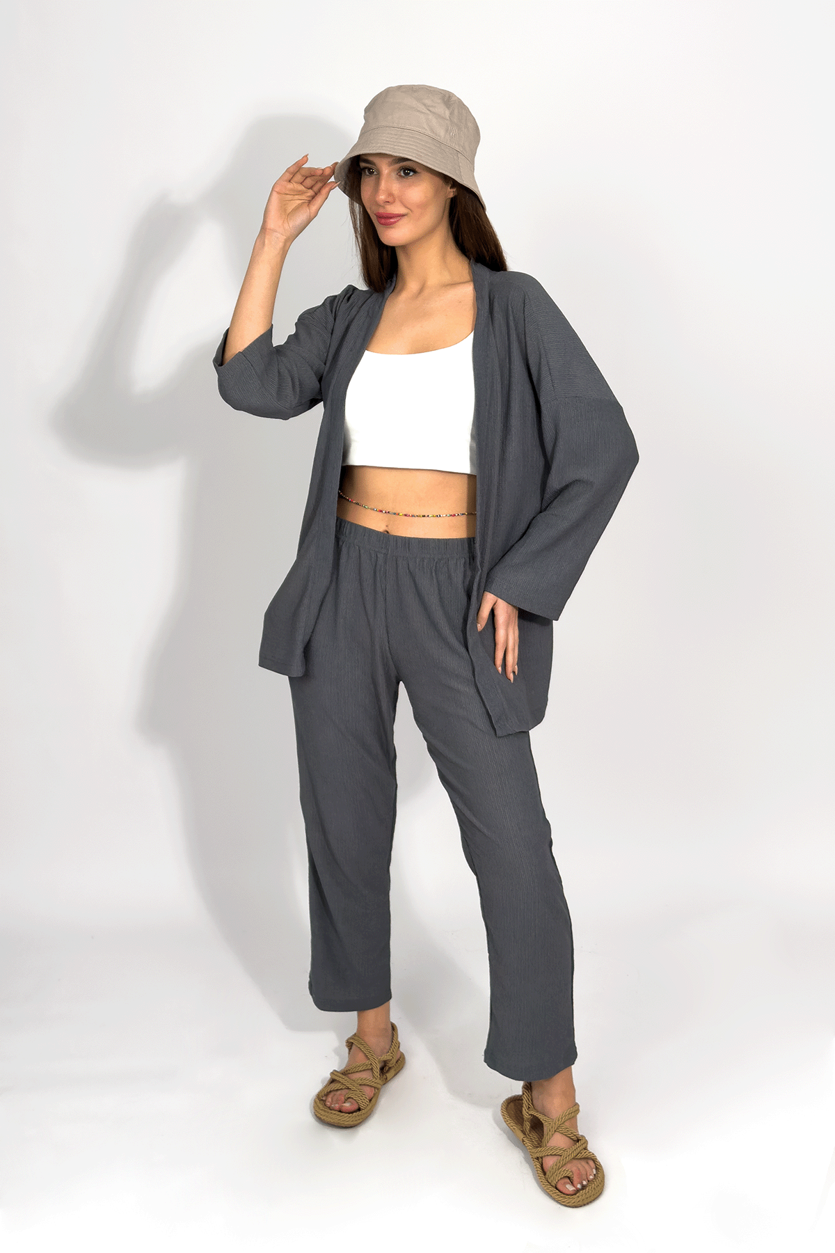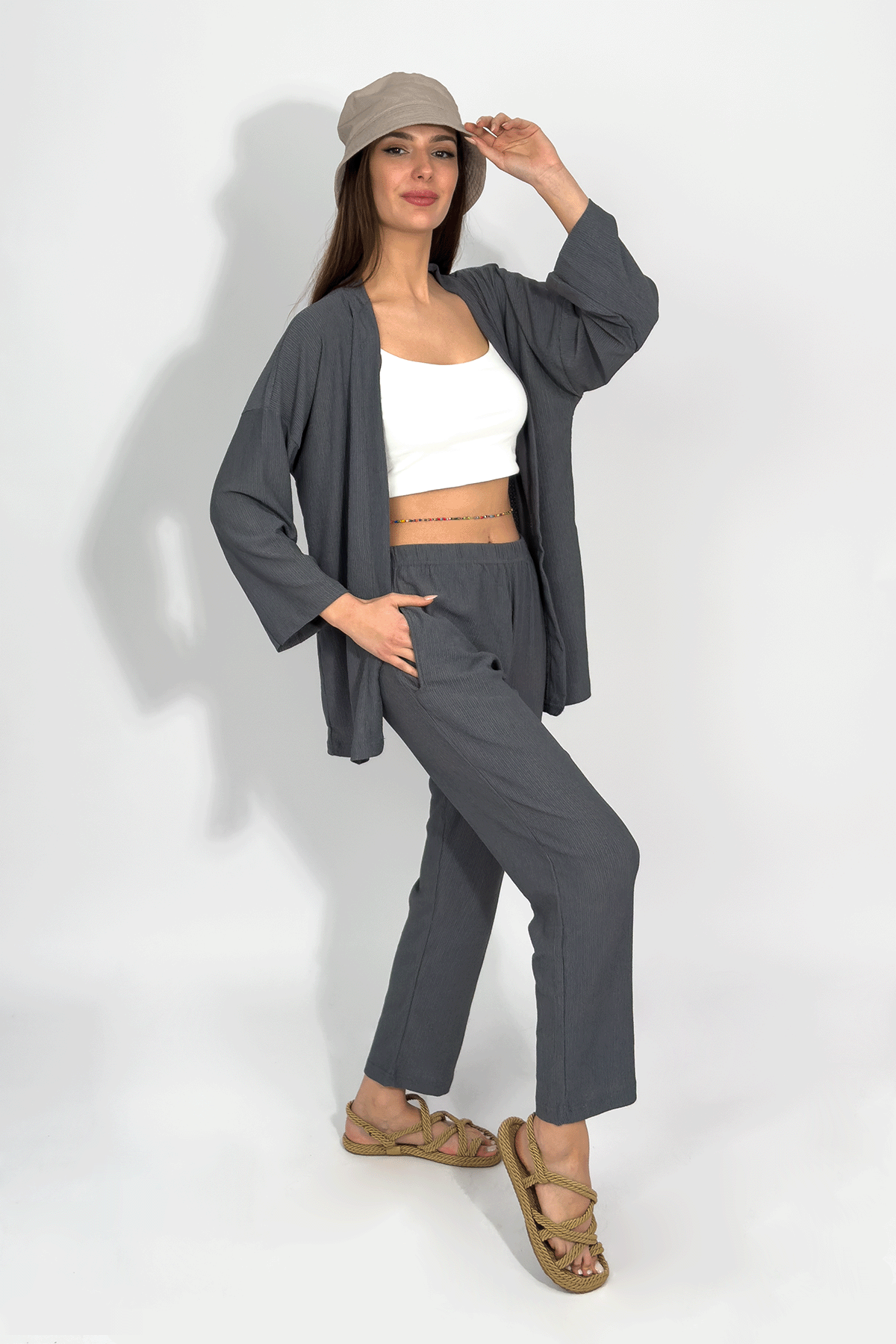 Kadın Pantolonlu Alt Üst İkili Kimono Takım Rahat Kalıp GRİ - S
