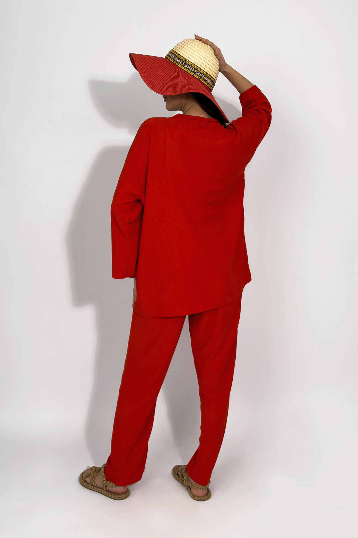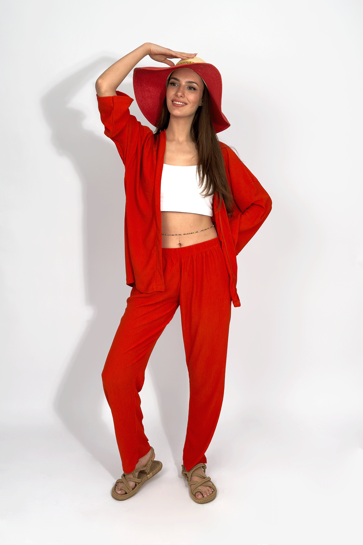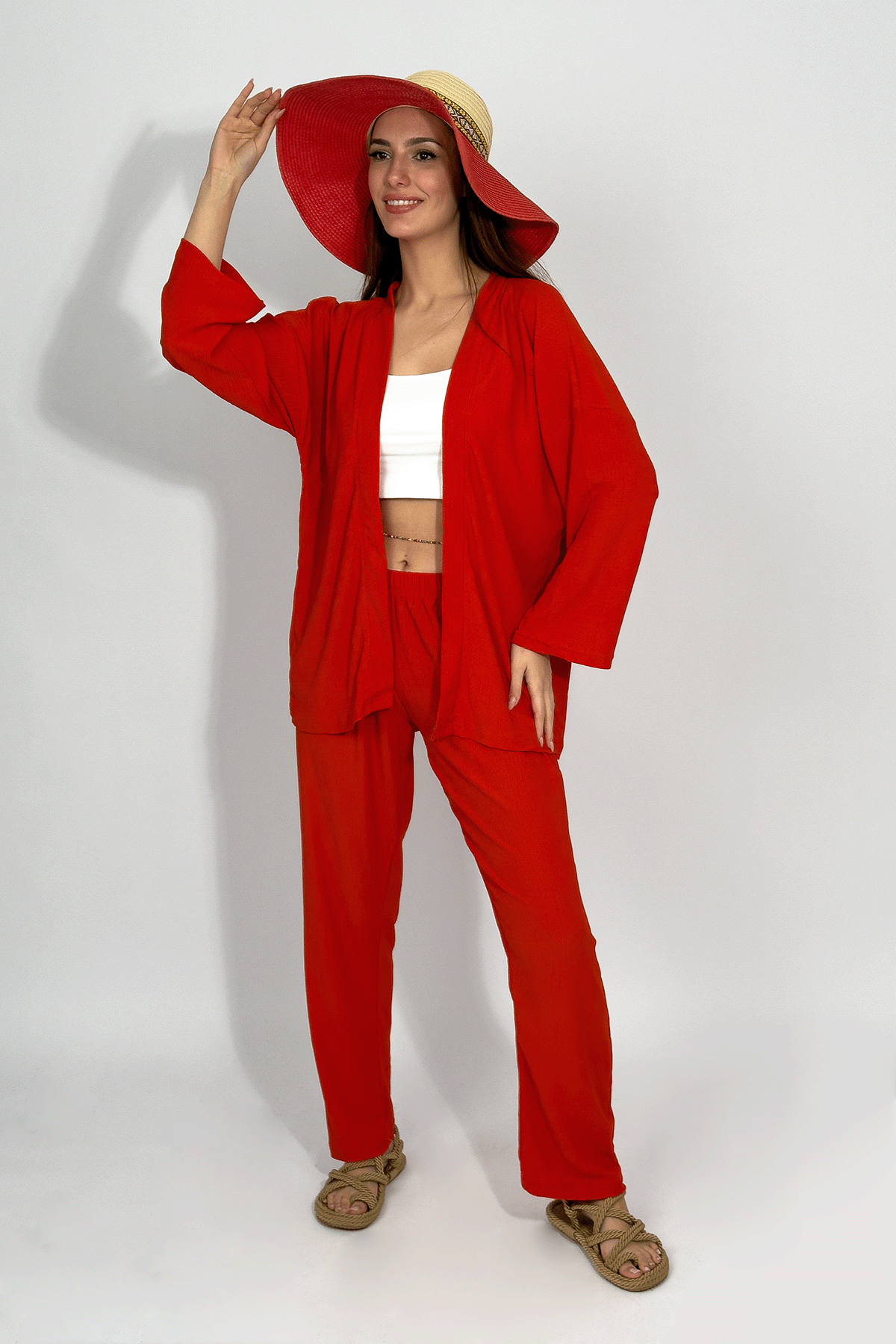 Kadın Pantolonlu Alt Üst İkili Kimono Takım Rahat Kalıp Kiremit - S Kadın Pantolonlu Alt Üst İkili Kimono Takım Rahat Kalıp KiremitSBrmckTakım
