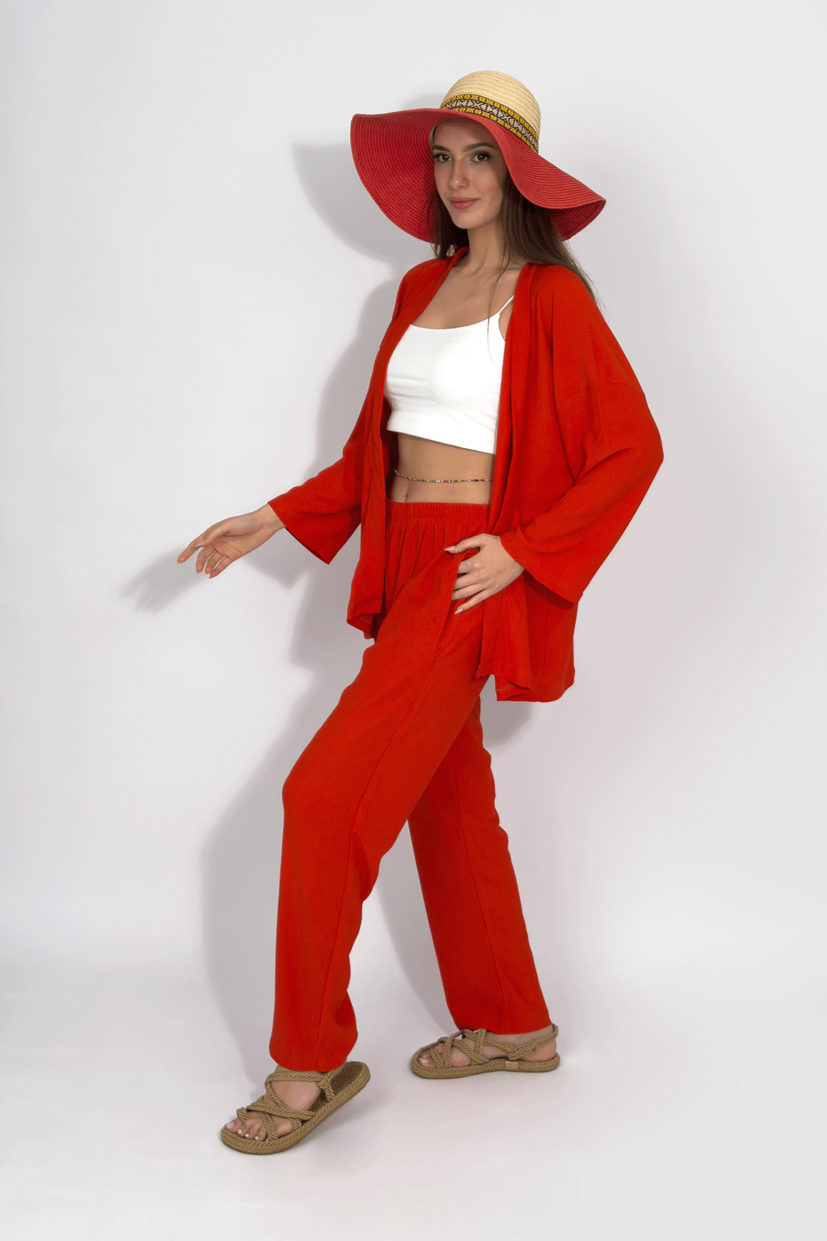 Kadın Pantolonlu Alt Üst İkili Kimono Takım Rahat Kalıp Kiremit - S