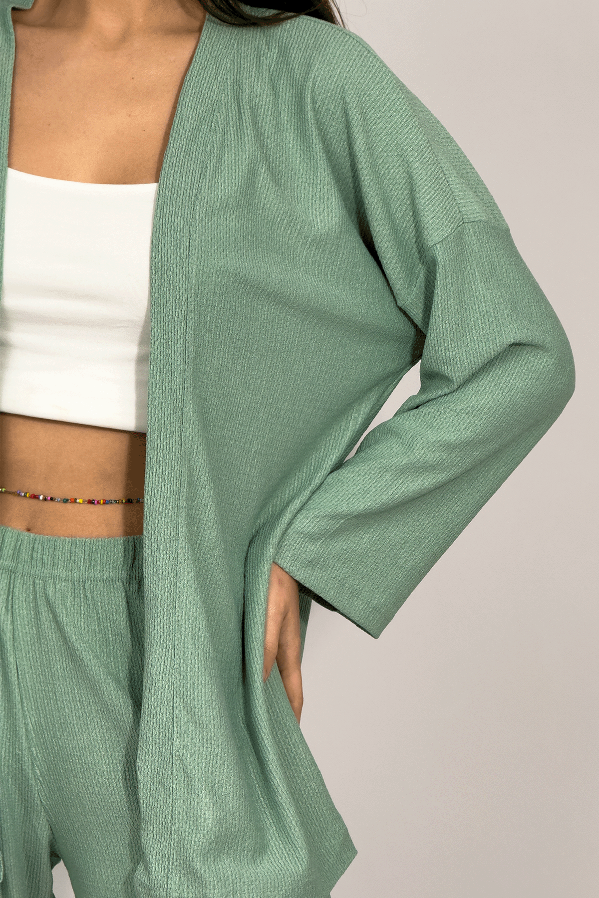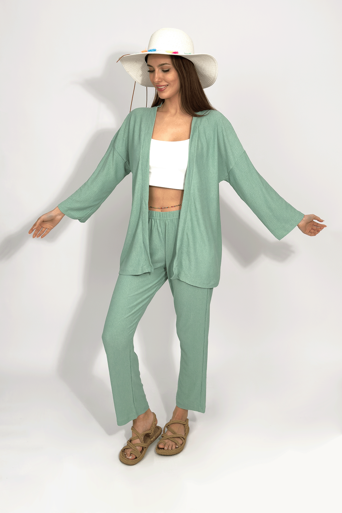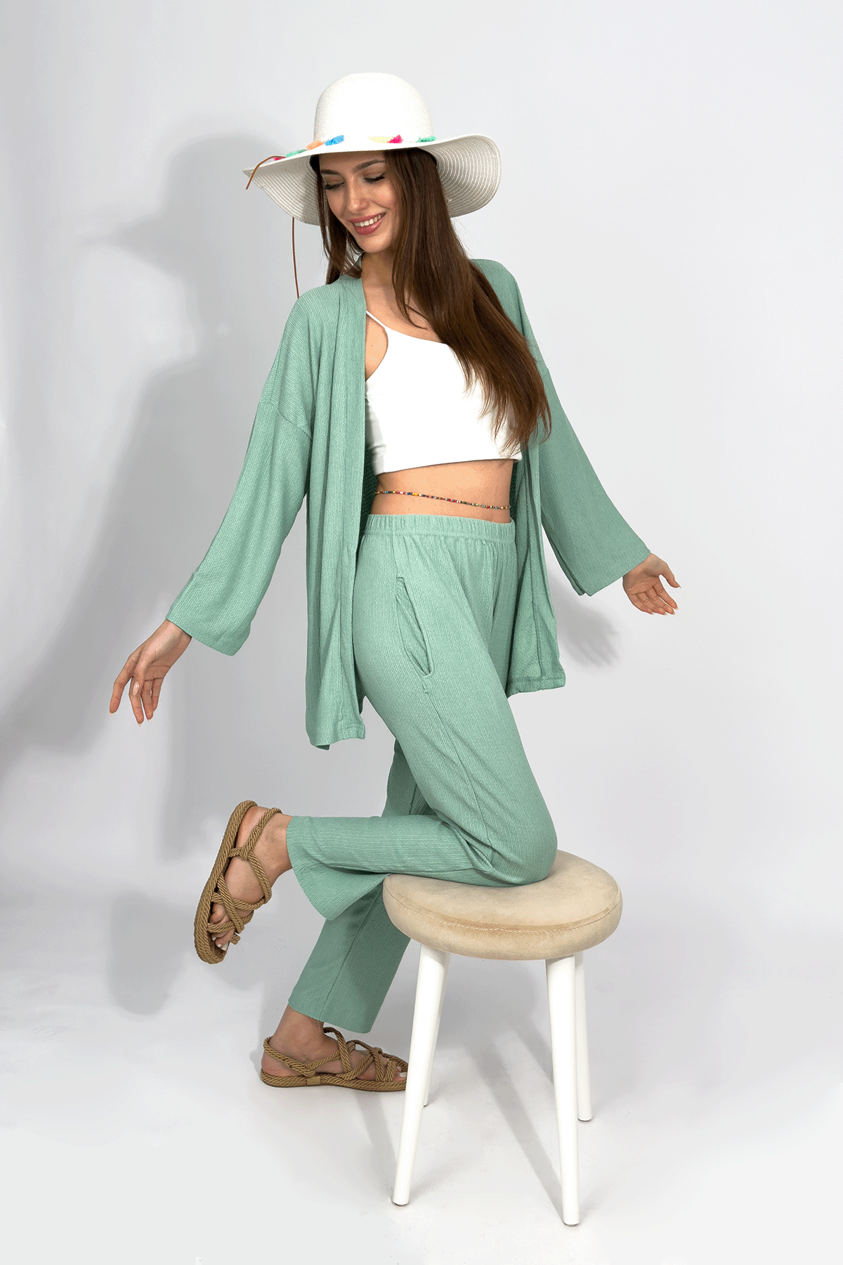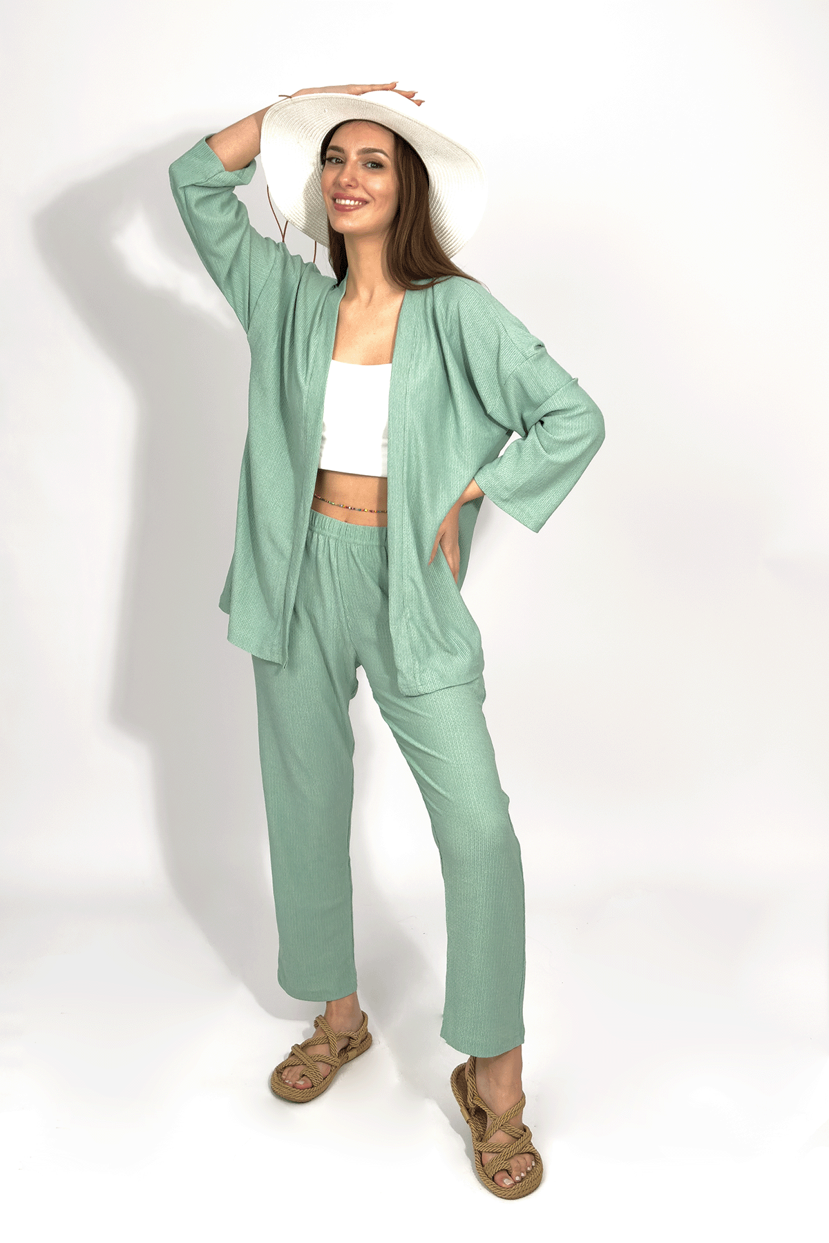 Kadın Pantolonlu Alt Üst İkili Kimono Takım Rahat Kalıp Mint Yeşili - XL Kadın Pantolonlu Alt Üst İkili Kimono Takım Rahat Kalıp MintYşlXLBrmckTkm