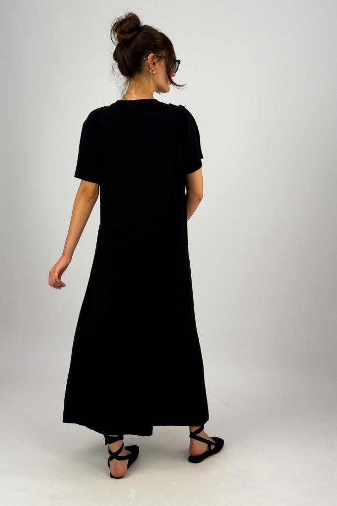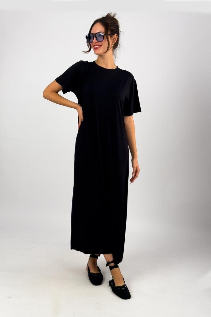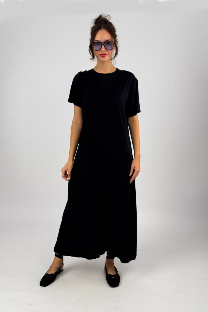 Kadın Yazlık Kısa Kollu Viskon Midi Boy Bisiklet Yaka Elbise SİYAH - L/XL